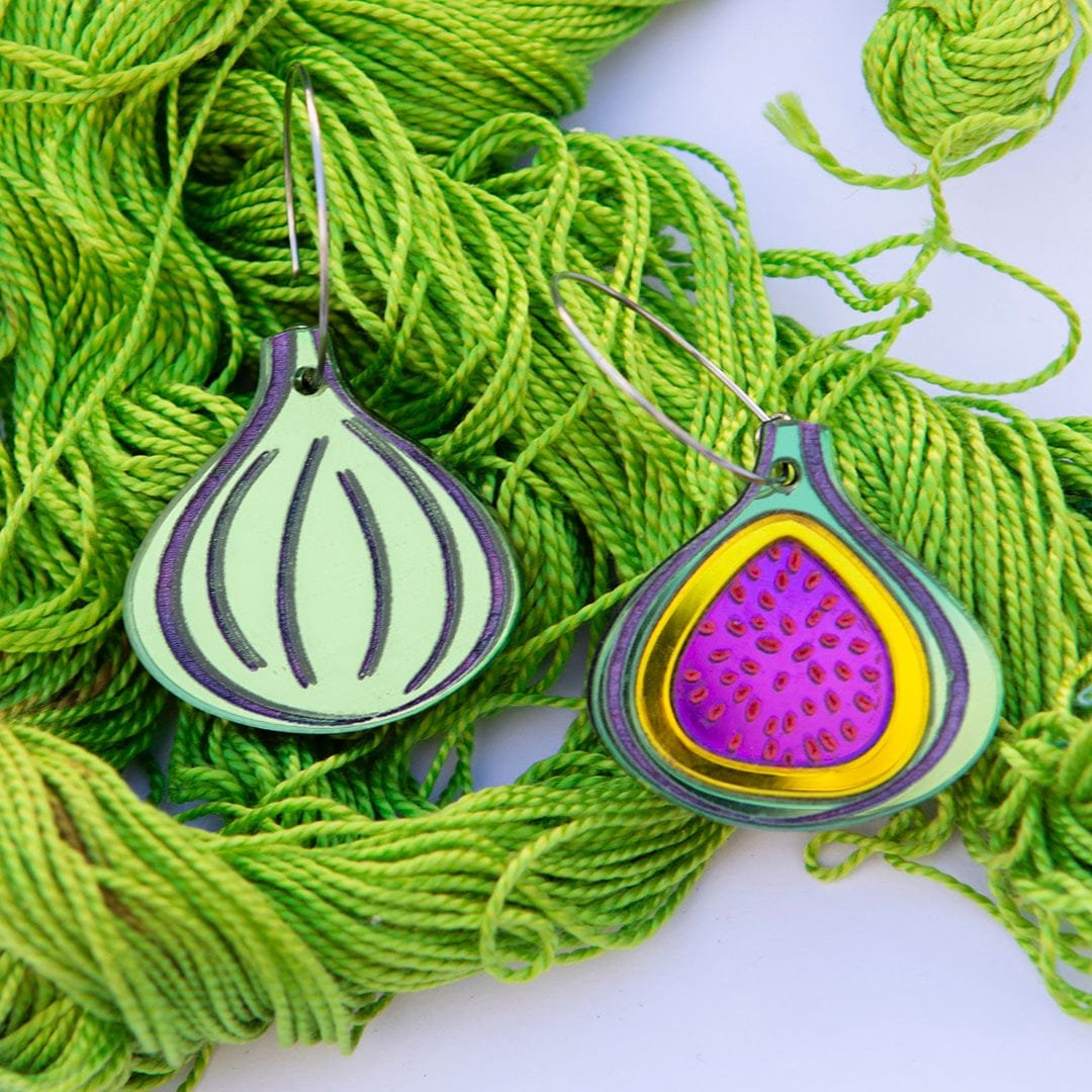 Los pendientes higo son la pieza más exótica de la colección. Hechos en metacrilato espejo y pintados a mano con gran detalle, combinan tonos vibrantes como el púrpura, verde lima y toques dorados. Su forma redondeada y colorida los convierte en un accesorio llamativo y con mucha personalidad.
